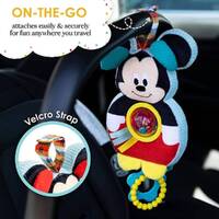 Keep baby happy and soothed with this adorable Mickey Mouse activity toy featuring soft texture, on-the-go velcro strap, spinner ball rattle, ribbons, teether rings, crinkle, and double-sided design. Hang this soft toy from a stroller or crib and watch baby's eyes light up from all the fun and developmental features! Mickey Mouse is an instantly recognizable friend, bringing sweet memories from childhood as it helps children to learn, play, and grow. Suitable from birth